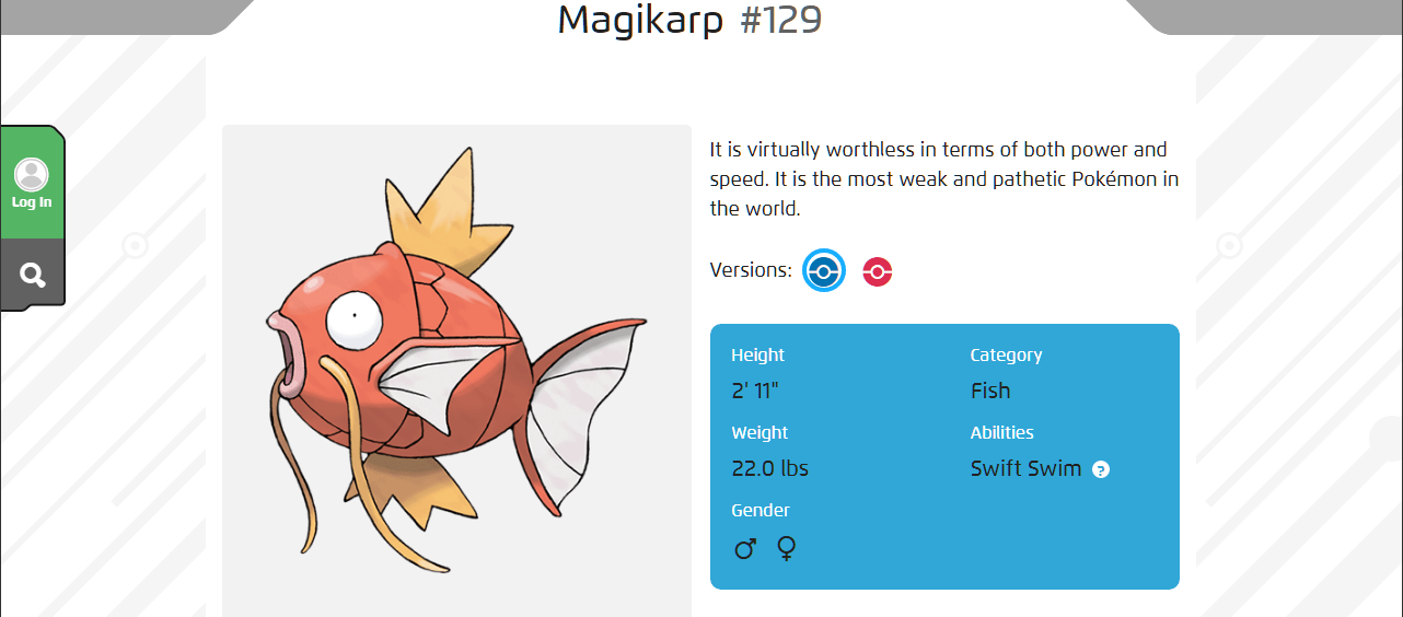 About magikarp is a pathetic excuse for a pokémon that is only capable of flopping and splashing... Vaporeon is the strongest one out of the three pokémon and jolteon is the weakest. Just want to make sure. Magikarp is a water pokémon. Magikarp was released with the game launch on july 6th, 2016. Magikarp's strongest moveset is splash & struggle and it has a max cp of 274. 17/07/2016 · why this pathetic little fish is actually the coolest pokémon in 'pokémon go' alex heath. Evolving mega léviator costs 200 mega energy the first time, and 40 mega energy every other time... Email updates for pokemon go.
